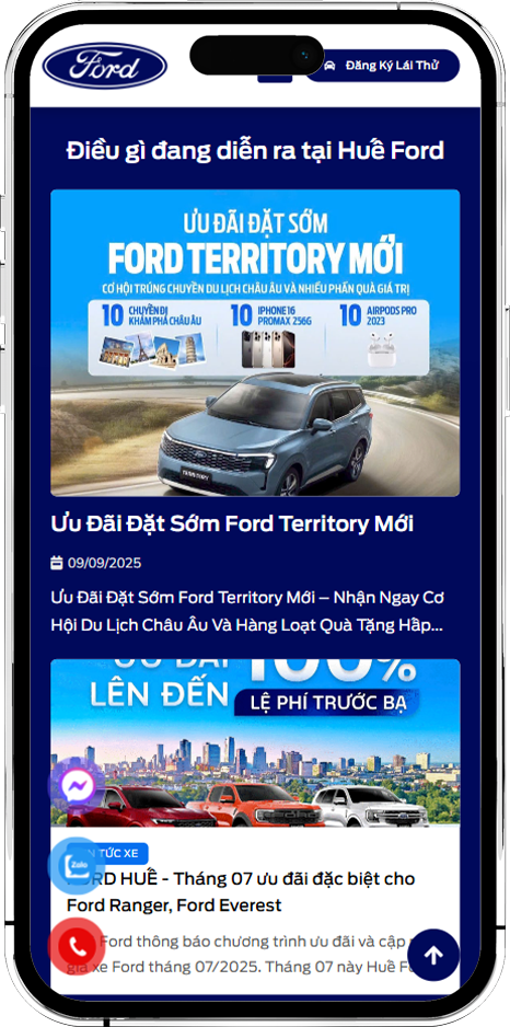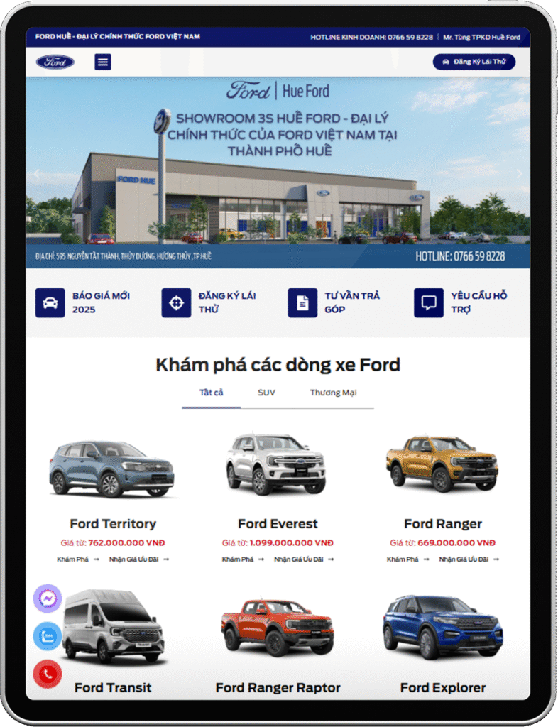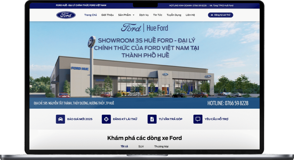 HUẾ FORD là đại lý chính hãng của Ford tại khu vực miền Trung, chuyên cung cấp dịch vụ bán xe, bảo dưỡng – sửa chữa và cung cấp phụ tùng chính hãng. Với mong muốn xây dựng kênh bán hàng trực tuyến hiện đại, nâng cao uy tín và tiếp cận khách hàng tiềm năng hiệu quả hơn, HUẾ FORD đã hợp tác cùng Trần Thiên Đạt để triển khai dự án thiết kế website chuẩn SEO.