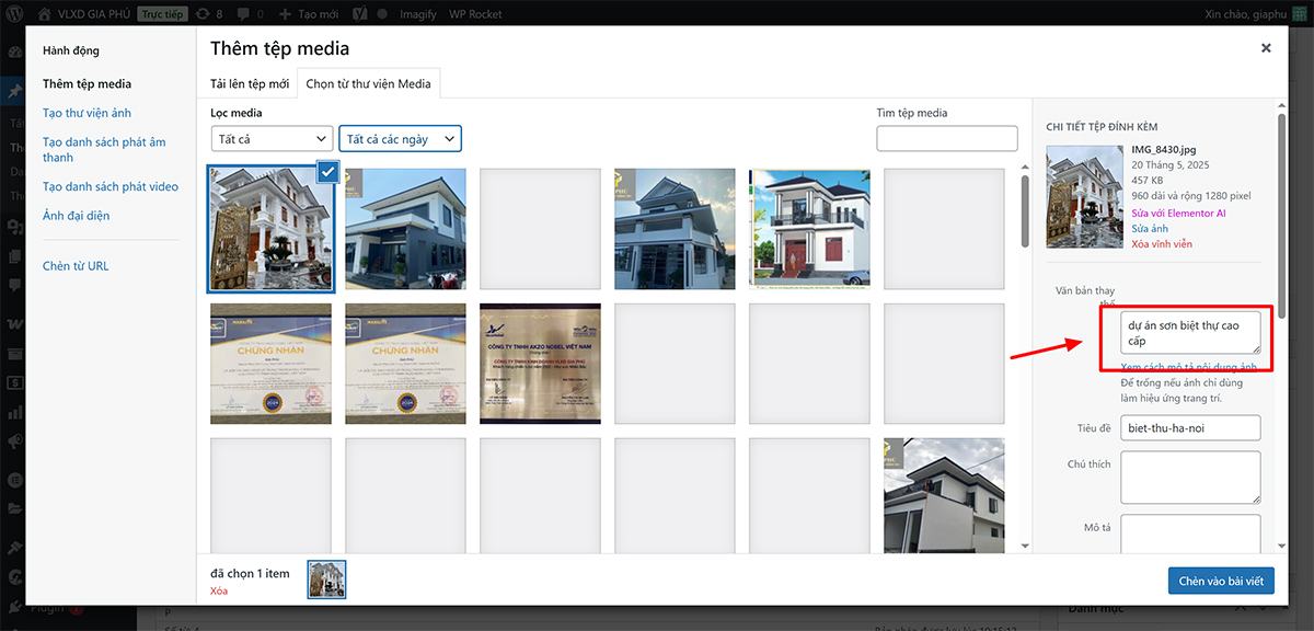 Nhấn Thêm Media → tải ảnh từ máy tính hoặc chọn ảnh có sẵn trong Thư viện.