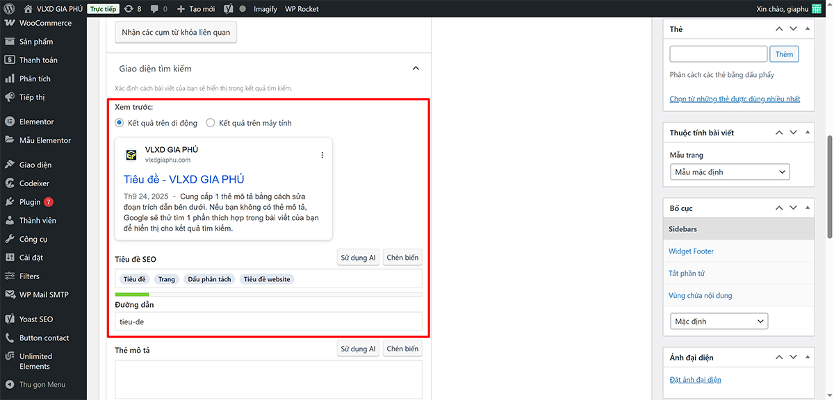 Nếu dùng plugin SEO (Yoast, Rank Math): nhập Meta Title, Meta Description, Focus Keyword.
