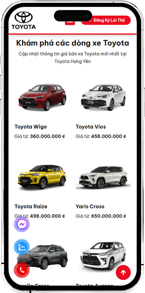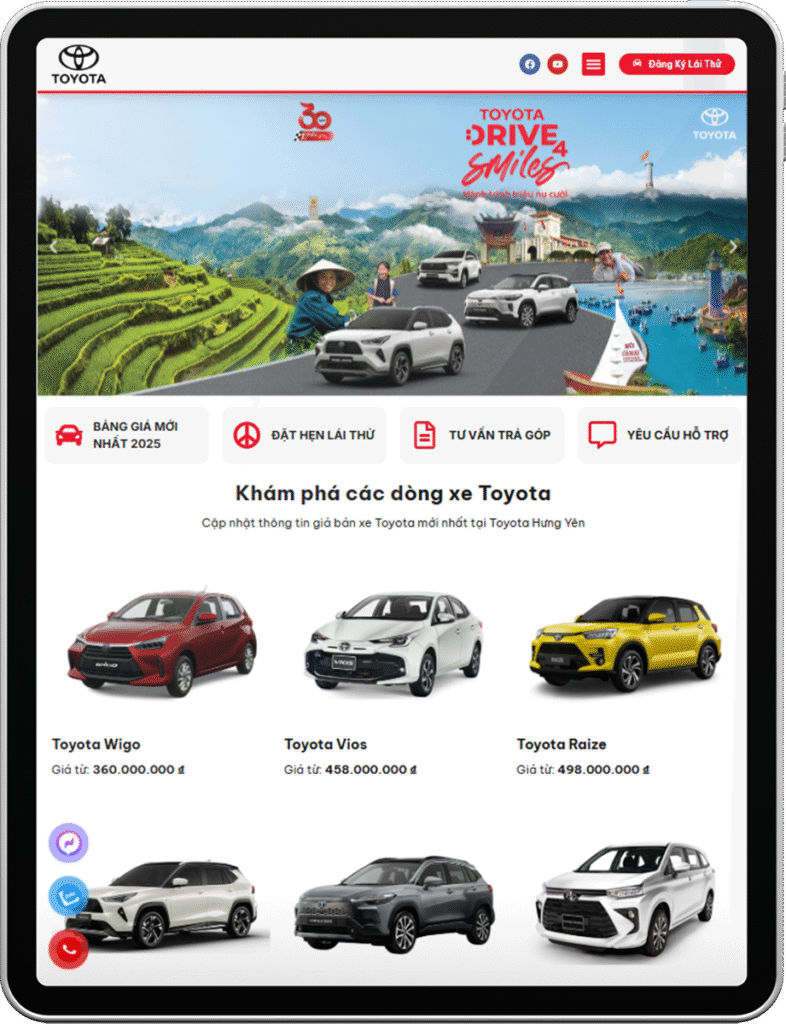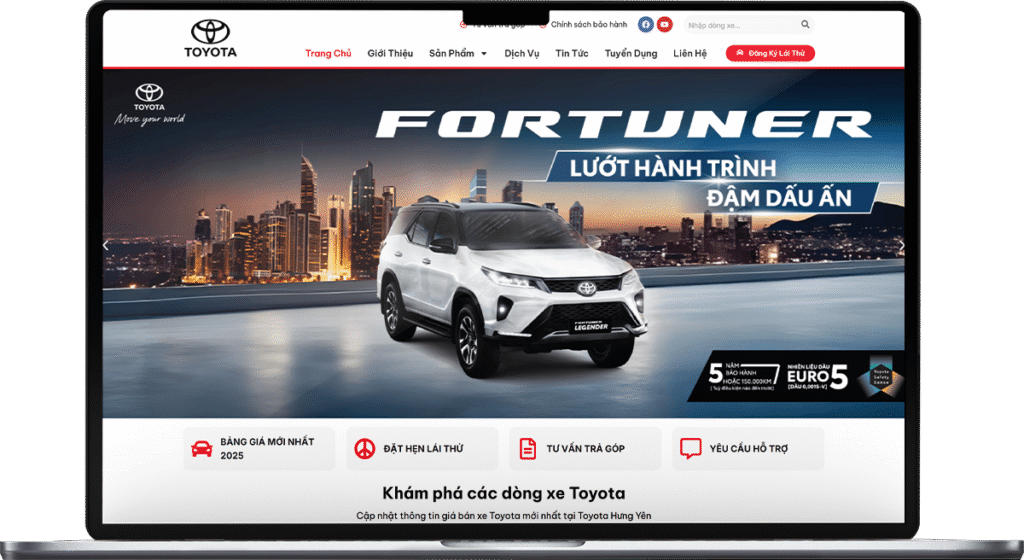 TOYOTA Hưng Yên – Đại lý 3S chính hãng chuyên cung cấp dịch vụ bán xe, bảo dưỡng – sửa chữa và cung cấp phụ tùng chính hãng cho khách hàng tại khu vực Hưng Yên và lân cận. Với mong muốn nâng cao uy tín thương hiệu và xây dựng kênh bán hàng trực tuyến hiệu quả, đại lý đã hợp tác cùng Trần Thiên Đạt để triển khai dự án thiết kế website chuẩn SEO, tối ưu trải nghiệm người dùng.