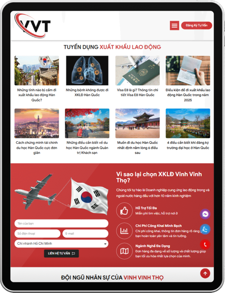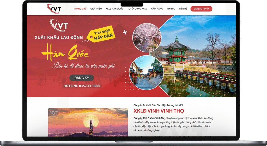 XKLĐ Vinh Vinh Thọ là đơn vị hoạt động trong lĩnh vực xuất khẩu lao động và du học, chuyên cung cấp các chương trình đào tạo, tư vấn và hỗ trợ người lao động Việt Nam ra nước ngoài làm việc, học tập. Với định hướng phát triển bền vững và mong muốn nâng cao uy tín thương hiệu, Vinh Vinh Thọ đã hợp tác cùng Trần Thiên Đạt để triển khai dự án thiết kế website chuẩn SEO.