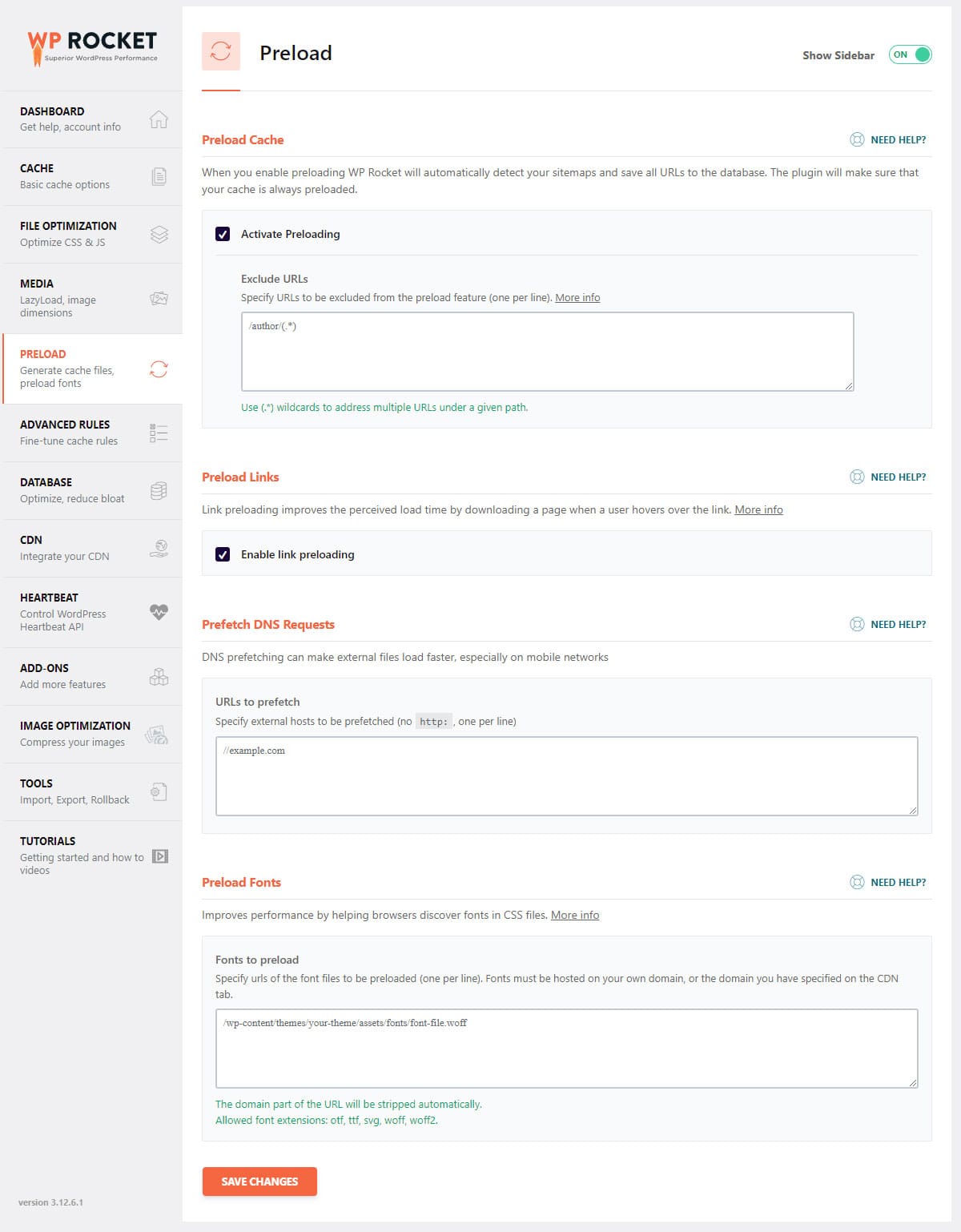 - Preload Fonts: Chỉ định các url của tệp phông chữ sẽ được tải trước (một url trên mỗi dòng). Phông chữ phải được lưu trữ trên miền của riêng bạn hoặc miền bạn đã chỉ định trên tab CDN.