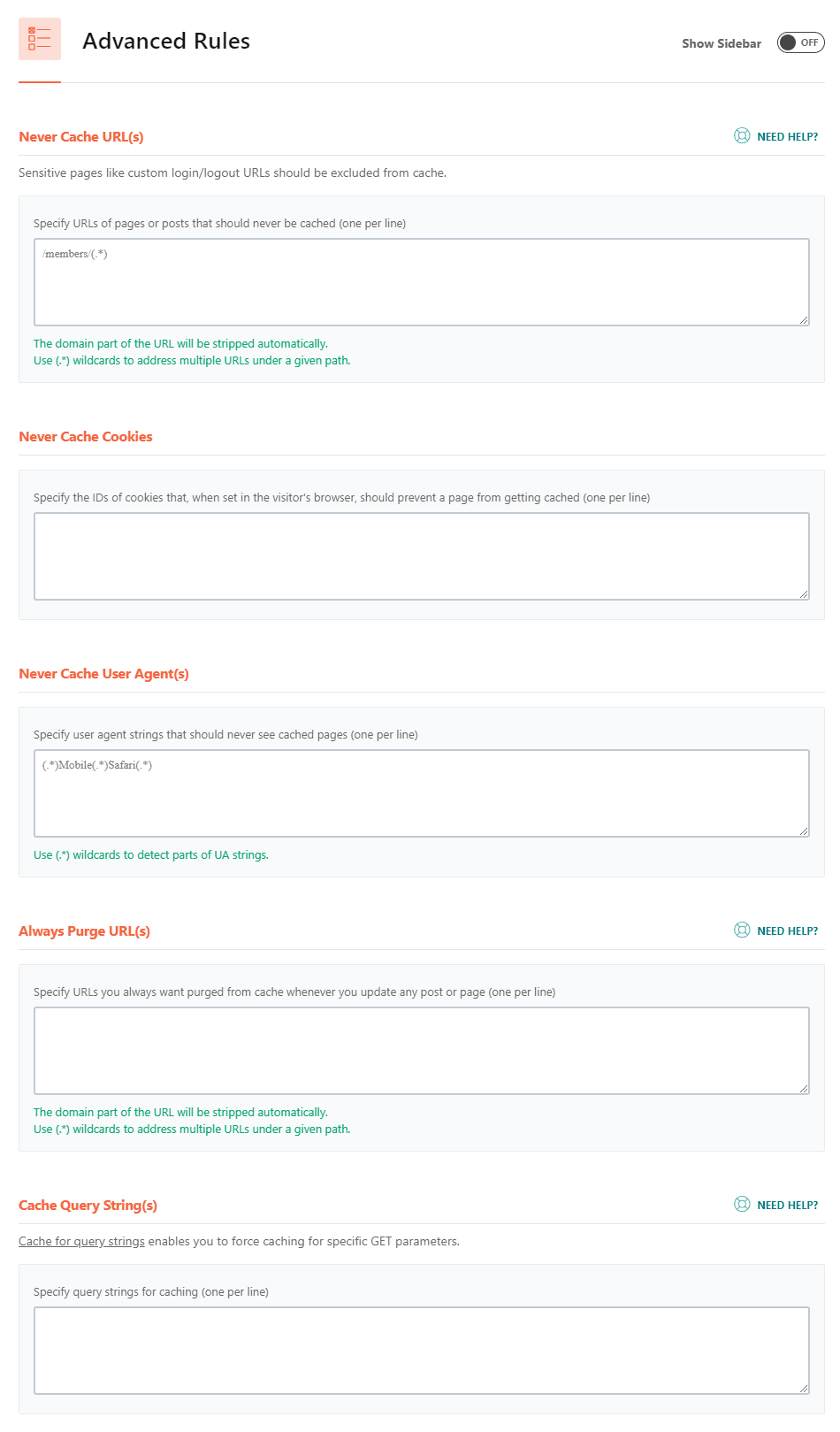 - Never Cache URL(s): Điền những URL mà bạn không muốn cache.