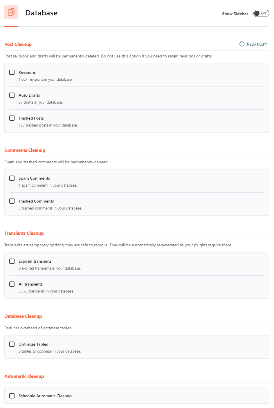- Schedule Automatic Cleanup: Thiết lập dọn dẹp database theo chu kỳ hàng ngày, hàng tuần hoặc hàng tháng.