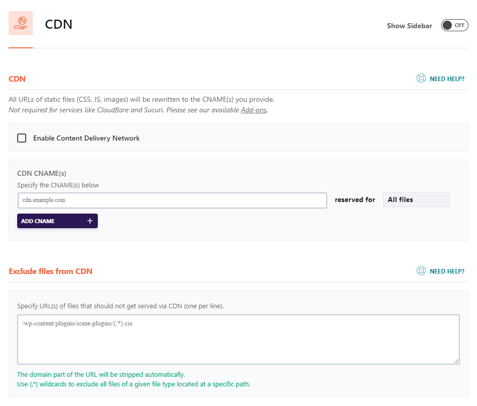 - CDN CNAME(s): Điền link CDN của bạn vào đây, chẳng hạn như cdn.example.com. Ngoài ra còn có tùy chọn cho phép bạn chạy toàn bộ file, chỉ hình ảnh, CSS và JS, chỉ JS hoặc chỉ CSS trên CDN.